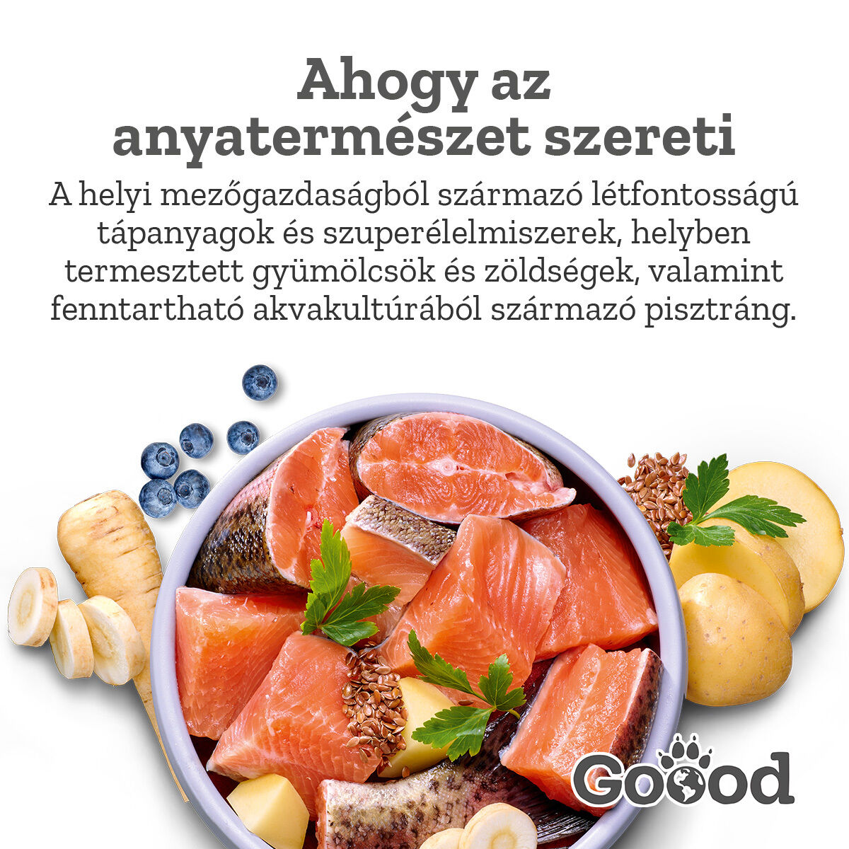 Annak érdekében, hogy pisztrángjaink jól érezzék magukat, haltenyésztőink odafigyelnek a kiváló vízminőségre és a stressz, például az erős napsugárzás elkerülésére. Így kapjuk a Goood kutyatápunkhoz a finom és egészséges pisztrángfilét. Ehhez a regionális bajor gazdálkodásból származó zöldségeket és petrezselymet is hozzáadjuk. Gabonamentes receptúránk nem igényel hozzáadott cukrot, mesterséges színezéket, aromát vagy tartósítószert, és az érzékeny gyomrú és ételintoleranciával küzdő kutyák számára is könnyen emészthető. A halban és a lenmagban található omega-3 és omega-6 zsírsavak jót tesznek a bőrnek és a szőrzetnek. Nedvestápunkat keverheted száraztáppal vagy önmagában is etetheted.